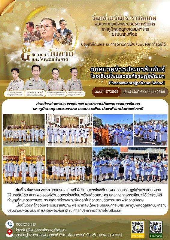 วันศุกร์ที่ 5 ธันวาคม 2568 ที่ผ่านมา นายประชา สมศรี ผู้อำนวยการโรงเรียนโพนสวรรค์ราษฎร์พัฒนา มอบหมายให้ นายธิปไตย จันทะพล รองผู้อำนวยการโรงเรียน พร้อมด้วยคณะครู บุคลากรทางการศึกษา ได้เข้าร่วมพิธีทำบุญตักบาตรถวายพระราชกุศล พิธีวางพานพุ่มดอกไม้ถวายราชสักการะ และพิธีถวายบังคม เนื่องในวันคล้ายวันพระบรมราชสมภพ พระบาทสมเด็จพระบรมชนกาธิเบศร มหาภูมิพลอดุลยเดชมหาราช บรมนาถบพิตร วันชาติ และวันพ่อแห่งชาติ ณ ศาลาประชาคมอำเภอโพนสวรรค์ |