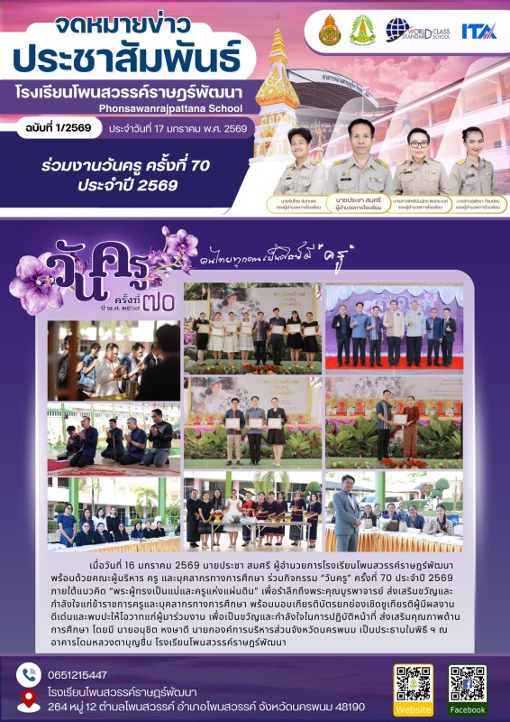 16 มกราคม 2569 คณะผู้บริหาร ครู และบุคลากรทางการศึกษา โรงเรียนโพนสวรรค์ราษฎร์พัฒนา เข้าร่วมกิจกรรม 7“วันครู” ครั้งที่ 70 ประจำปี 2569