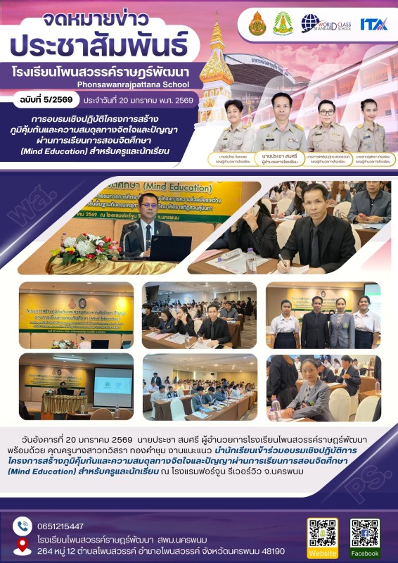 วันอังคารที่ 20 มกราคม 2569 นายประชา สมศรี ผู้อำนวยการโรงเรียนโพนสวรรค์ราษฎร์พัฒนาพร้อมด้วย คุณครูนางสาวกวิสรา ทองคำชุม งานแนะแนว นำนักเรียนเข้าร่วมอบรมเชิงปฏิบัติการโครงการสร้างภูมิคุ้มกันและความสมดุลทางจิตใจและปัญญาผ่านการเรียนการสอนจิตศึกษา(Mind Education) สำหรับครูและนักเรียน ณ โรงแรมฟอร์จูน รีเวอร์วิว จ.นครพนม