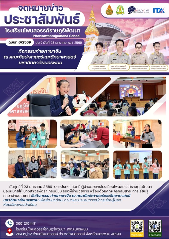 วันศุกร์ที่ 23 มกราคม 2569 นายประชา สมศรี ผู้อำนวยการโรงเรียนโพนสวรรค์ราษฎร์พัฒนามอบหมายให้ นางสาวสุพัตรา ภิรมย์ชม รองผู้อำนวยการ พร้อมด้วยคณะครูกลุ่มสาระการเรียนรู้ภาษาต่างประเทศ จัดกิจกรรม ค่ายภาษาจีน ณ คณะศิลปะศาสตร์และวิทยาศาสตร์ มหาวิทยาลัยนครพนม เพื่อพัฒนาทักษะภาษาและประสบการณ์การเรียนรู้นอกห้องเรียนของนักเรียน |