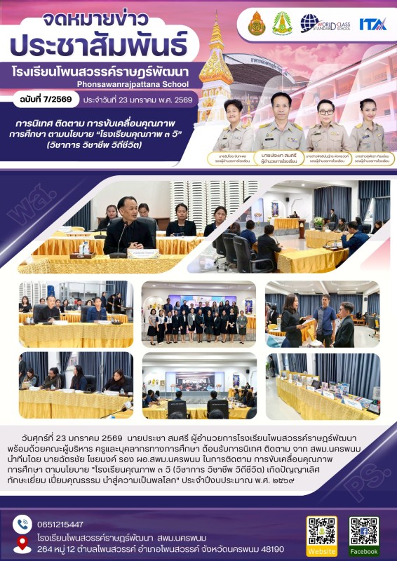วันศุกร์ที่ 23 มกราคม 2569 นายประชา สมศรี ผู้อำนวยการโรงเรียนโพนสวรรค์ราษฎร์พัฒนาพร้อมด้วยคณะผู้บริหาร ครูและบุคลากรทางการศึกษา ต้อนรับการนิเทศ ติดตาม จาก สพม.นครพนมนำทีมโดย นายฉัตรชัย ไชยมงค์ รอง ผอ.สพม.นครพนม ในการติดตาม การขับเคลื่อนคุณภาพ