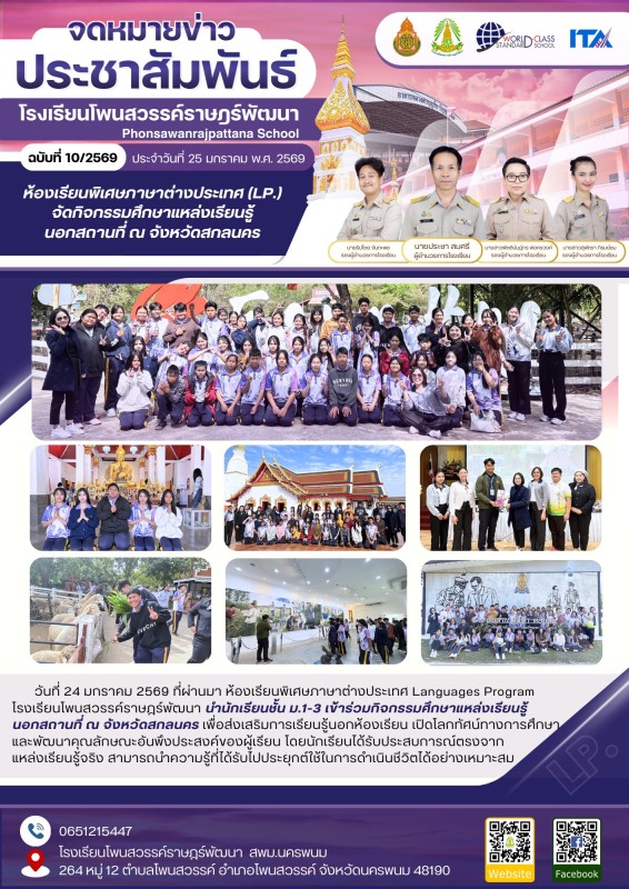 วันที่ 24 มกราคม 2569 ที่ผ่านมา ห้องเรียนพิเศษภาษาต่างประเทศ Languages Program โรงเรียนโพนสวรรค์ราษฎร์พัฒนา นำนักเรียนชั้น ม.1-3 เข้าร่วมกิจกรรมศึกษาแหล่งเรียนรู้นอกสถานที่ ณ จังหวัดสกลนคร เพื่อส่งเสริมการเรียนรู้นอกห้องเรียน เปิดโลกทัศน์ทางการศึกษา และพัฒนาคุณลักษณะอันพึงประสงค์ของผู้เรียน โดยนักเรียนได้รับประสบการณ์ตรงจากแหล่งเรียนรู้จริง สามารถนำความรู้ที่ได้รับไปประยุกต์ใช้ในการดำเนินชีวิตได้อย่างเหมาะสม