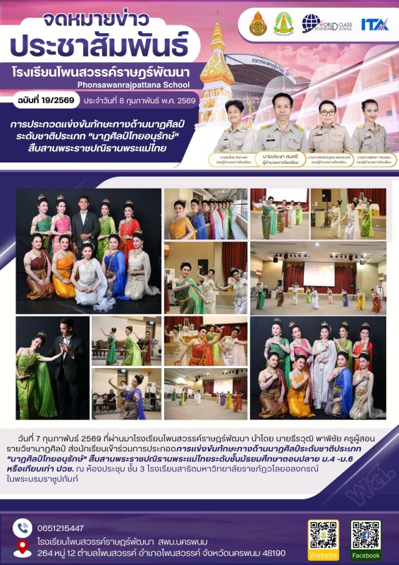 วันที่ 7 กุมภาพันธ์ 2569 ที่ผ่านมาโรงเรียนโพนสวรรค์ราษฎร์พัฒนา นำโดย นายธีรวุฒิ พาพิชัย ครูผู้สอนรายวิชานาฏศิลป์ ส่งนักเรียนเข้าร่วมการประกวดการเเข่งขันทักษะทางด้านนาฏศิลป์ระดับชาติประเภท "นาฏศิลป์ไทยอนุรักษ์" สืบสานพระราชปณิธานพระเเม่ไทยระดับชั้นมัธยมศึกษาตอนปลาย ม.4 -ม.6 หรือเทียบเท่า ปวช. ณ ห้องประชุม ชั้น 3 โรงเรียนสาธิตมหาวิทยาลัยราชภัฏวไลยอลงกรณ์ ในพระบรมราชูปถัมภ์ |