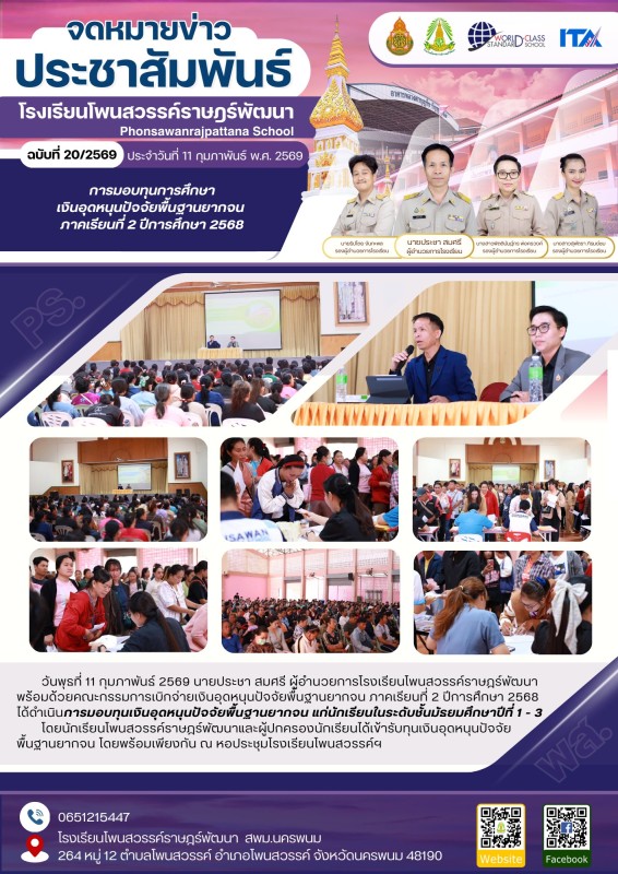 วันพุธที่ 11 กุมภาพันธ์ 2569 นายประชา สมศรี ผู้อำนวยการโรงเรียนโพนสวรรค์ราษฎร์พัฒนา พร้อมด้วยคณะกรรมการเบิกจ่ายเงินอุดหนุนปัจจัยพื้นฐานยากจน ภาคเรียนที่ 2 ปีการศึกษา 2568ได้ดำเนินการมอบทุนเงินอุดหนุนปัจจัยพื้นฐานยากจน แก่นักเรียนในระดับชั้นมัธยมศึกษาปีที่ 1 - 3 โดยนักเรียนโพนสวรรค์ราษฎร์พัฒนาและผู้ปกครองนักเรียนได้เข้ารับทุนเงินอุดหนุนปัจจัยพื้นฐานยากจน โดยพร้อมเพียงกัน ณ หอประชุมโรงเรียนโพนสวรรค์ฯ