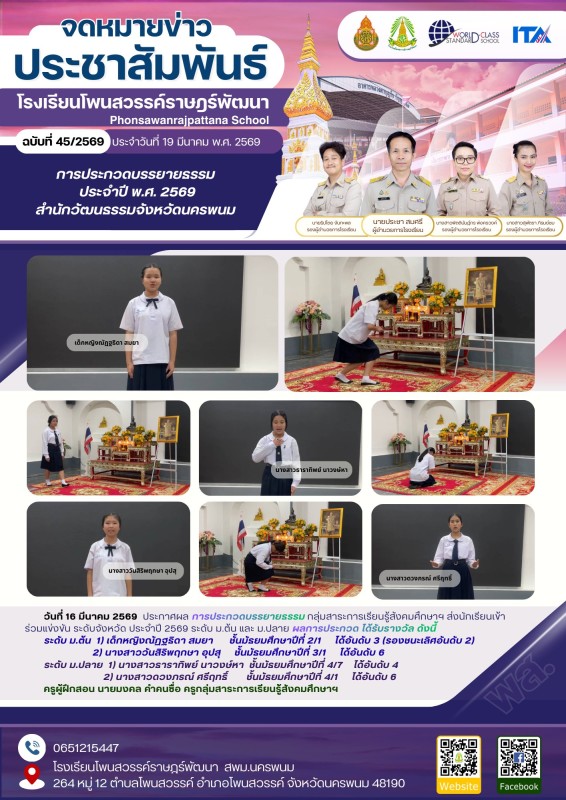 วันที่ 16 มีนาคม 2569 ขอแสดงความยินดีกับนักเรียนและคุณครูผู้ฝึกสอน การประกวดบรรยายธรรม ระดับจังหวัด ประจำปี 2569 ระดับ ม.ต้น และ ม.ปลาย