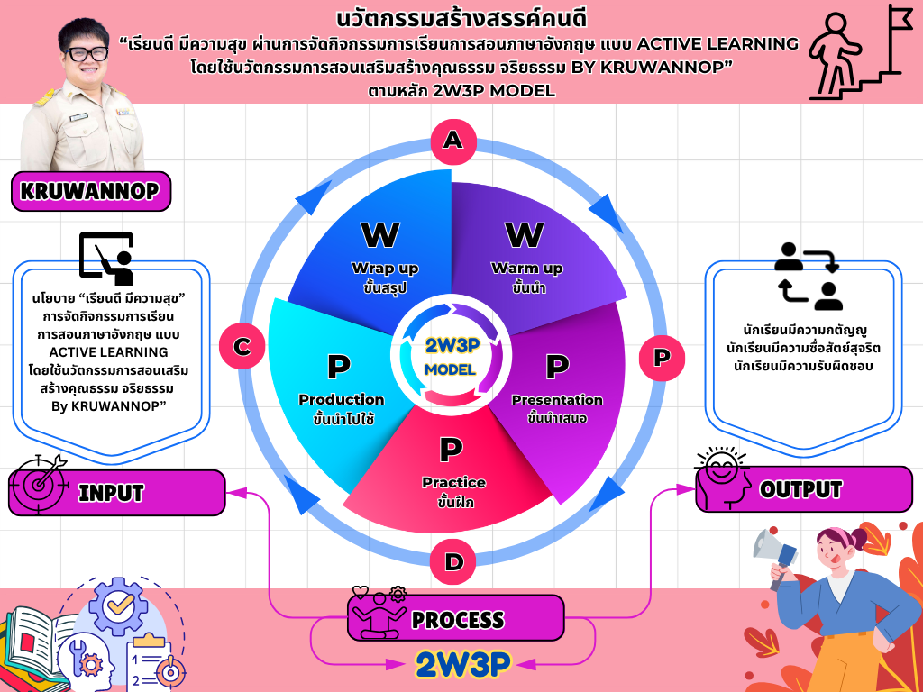 นวัตกรรมสร้างสรรค์คนดี “เรียนดี มีความสุข ผ่านการจัดกิจกรรมการเรียนการสอนภาษาอังกฤษ แบบ ACTIVE LEARNING โดยใช้ นวัตกรรมการสอนเสริมสร้างคุณธรรม จริยธรรม By KRUWANNOP” ตามหลักโมเดล 2W3P