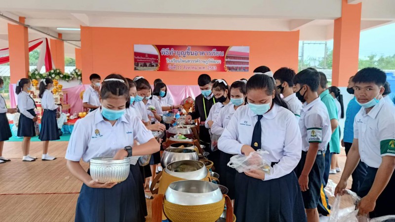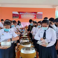 นักเรียนทำบุญตักบาตร เนื่องในพิธีเปิดอาคารเรียนหลังใหม่