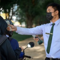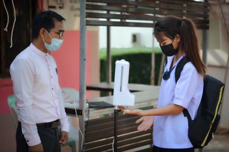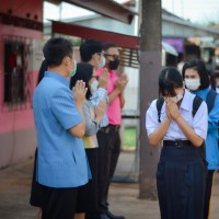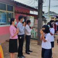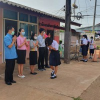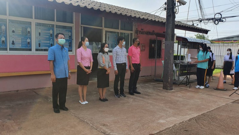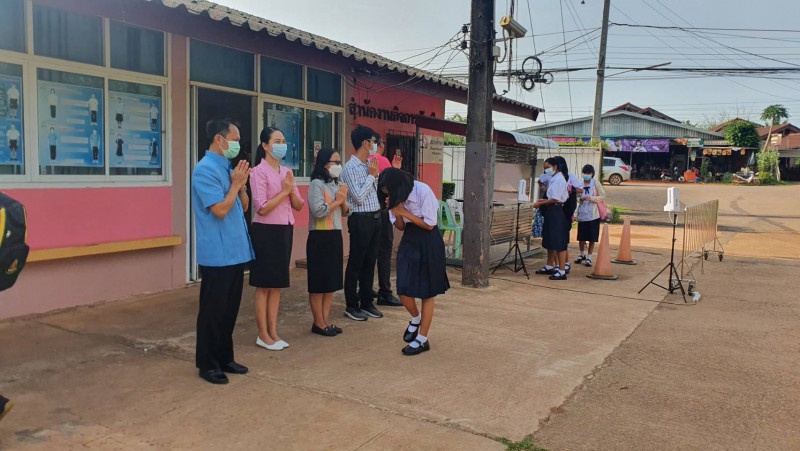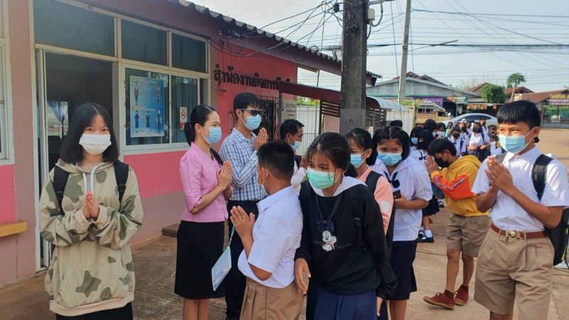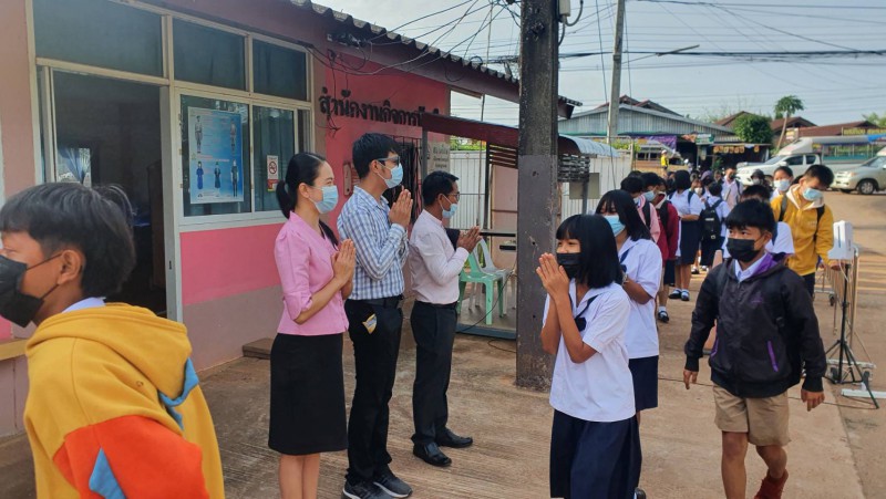 บรรยากาศของการเปิดเทอมวันแรก วันที่ 17 พฤษภาคม 2565 ท่านผู้อำนวยการ นายยอดชาย พ่อหลอน พร้อมด้วยคณะครูยืนต้อนรับนักเรียนตอนเช้าด้านหน้าประตูโรงเรียน