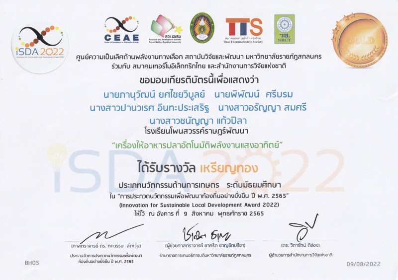 พวกเราชาว พ.ส. ขอแสดงความยินดีครูและนักเรียนที่เข้าร่วมประกวดนวัตกรรมเพื่อการพัฒนาท้องถิ่นอย่างยั่งยืน ปี พ.ศ. 2565 ชื่อนวัตกรรม : เครื่องให้อาหารปลาอัตโนมัติพลังงานแสงอาทิตย์ และสามารถคว้ารางวัลรับ รางวัลเหรียญทอง ประเภทนวัตกรรมด้านการเกษตร ระดับมัธยมศึกษา วันที่ 9 สิงหาคม พ.ศ. 2565 ณ หอประชุมจามจุรี 1 มหาวิทยาลัยราชภัฎสกลนคร จังหวัดสกลนคร