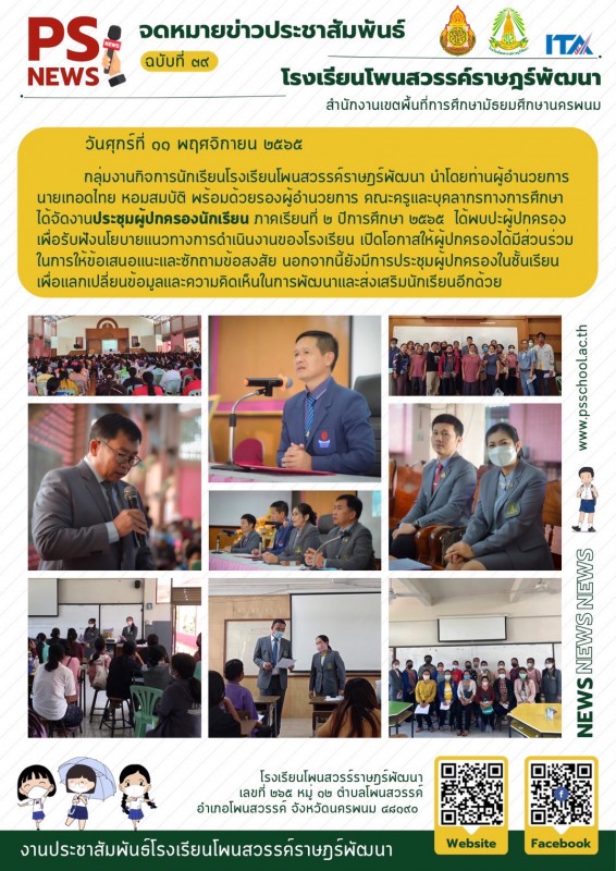 วันศุกร์ที่ 11 พฤศจิกายน 2565 นายเทอดไทย หอมสมบัติ ผู้อำนวยการโรงเรียนโพนสวรรค์ราษฎร์พัฒนา เป็นประธานในพิธีการประชุมผู้ปกครองนักเรียน ประจำปีการศึกษา 2565 ภาคเรียนที่ 2 โดยทางงานกลุ่มกิจการนักเรียนร่วมกับคณะผู้บริหาร คณะครูที่ปรึกษาร่วมกันจัดขึ้น เพื่อเป็นการพบปะและรับฟังนโยบายแนวทางการดำเนินงานของโรงเรียน เปิดโอกาสให้ผู้ปกครองมีส่วนร่วมในการนำเสนอข้อมูลข้อ ชีแนะแนวทาง พร้อมซักถามข้อสงสัย นอกจากนี้ยังมีการประชุมผู้ปกกครองในระดับชั้นเรียน (Classroom meeting) เพื่อแลกเปลี่ยนข้อมูลและความคิดเห็นในการมีส่วนร่วมในการแก้ไขพฤติกรรมนักเรียน การพัฒนาและส่งเสริมนักเรียน |