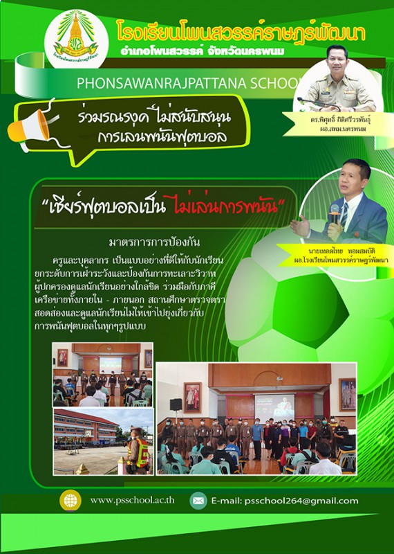 โรงเรียนโพนสวรรค์ราษฎร์พัฒนา นำโดยท่านผู้อำนวยการเทอดไทย หอมสมบัติ ได้มีมาตรการการป้องกันการเล่นการพนันฟุตบอล ร่วมรณรงค์ ไม่สนับสนุน การเล่นการพนันฟุตบอล "เชียร์ฟุตบอลเป็น ไม่เล่นการพนัน" ในช่วงฟุตบอลโลก ฟีฟาเวิร์ลคัพ กาตาร์ 2022 ครูและบุคลากรเป็นแบบอย่างที่ดีให้กับนักเรียน ยกระดับเฝ้าระวังและป้องกันการทะเลาะวิวาท ร่วมกับผู้ปกครองและภาคีเครือข่ายทั้งภายใน - ภายนอก ตรวจตราสอดส่อง ดูแลนักเรียนไม่ให้เข้าไปยุ่งยาเสพติด การพนันฟุตบอลในทุกๆรูปแบบ |