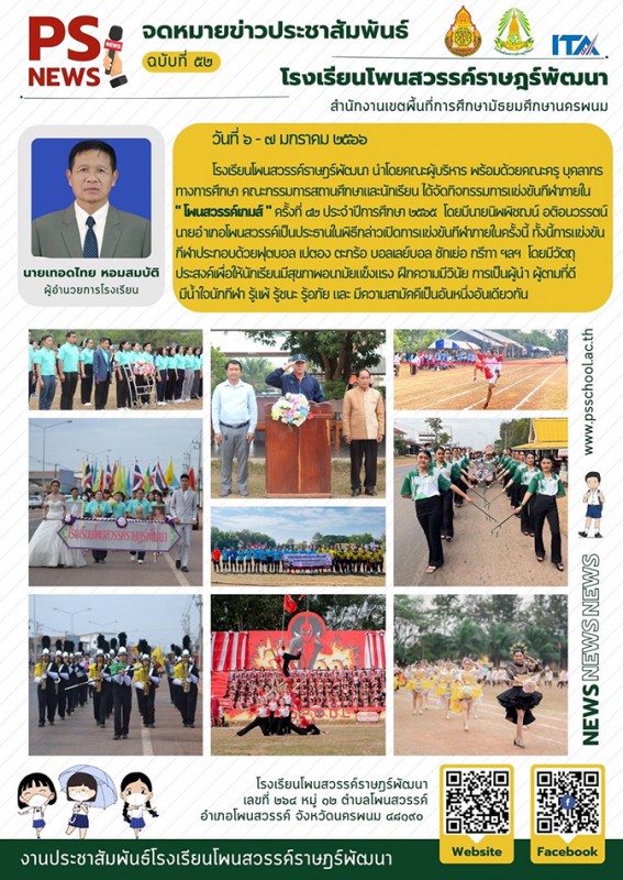 วันที่ 6-7 มกราคม 2565 โรงเรียนโพนสวรรค์ราฏร์พัฒนา นำโดยนายเทอดไทย หอมสมบัติ ผู้อำนวยการโรงเรียนและคณะผู้บริหารพร้อมด้วยคณะครูบุคลากรทางการศึกษา คณะกรรมการสถานศึกษาขั้นพื้นฐาน นักเรียน ได้จัดกิจกรรมการแข่งขันกีฬาภายใน "โพนสวรรค์เกมส์" ครั้ที่ 42 ประจำปีการศึกษา 2565 โดยมีนายนิพพิชฌน์ อติอนวรรตน์ นายอำเภอโพนสวรรค์ ให้เกียรติมาเป็นประธานพิธีเปิดในการแข่งขันกีฬาในครั้งนี้ โดยมีรายการแข่งขันประกอบไปด้วย ฟุตบอล เปตอง วอลเลย์บอล เซปัคตะกร้อ กรีฑา และกีฬาพื้นบ้าน ชักกะเย้อ มีการประกวดกองเชือร์ลีดเดอร์ ฯลฯ โดยมีวัตถุประสงค์เพื่อให้นักเรียนมีสุขภาพพลามัยแข็งแรง ฝึกมีความวินัย ความเป็นผู้นำ ผู้ตามที่ดี มีน้ำใจนักกีฬา รู้แพ้ รู้ชนะ รู้อภัย มีความเป็นหนึ่งอันเดียวกัน สามารถดาวน์โหลดภาพเพิ่มเติมจากลิงค์ที่อยู่ด้านล่างนี้ครับ