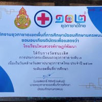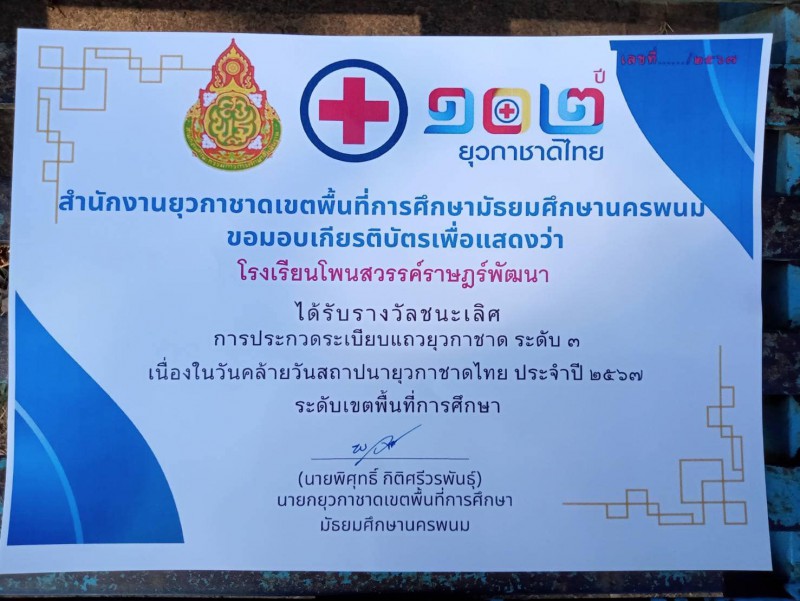 วัน พุธ ที่ 24 มกราคม พ.ศ. 2567 นำโดย นายเทอดไทย หอมสมบัติ ผู้อำนวยการโรงเรียน นายราชันย์ ไชยมหา นางสาวพิตตินันฏ์กร พ่อครวงค์ รองผู้อำนวยการโรงเรียน ได้มอบหมายให้งานยุวกาชาด ได้เข้าร่วมประกวดระเบียบแถวยุวกาชาด ระดับ 3 ได้รับรางวัลชนะเลิศ เนื่องในวันคล้ายวันสถาปนายุวกาชาดไทย ประจำปี 2567 ระดับเขตพื้นที่การศึกษามัธยมศึกษานครพนม ณ สนามโรงเรียนนครพนมวิทยาคม อ.เมือง จ.นครพนม |