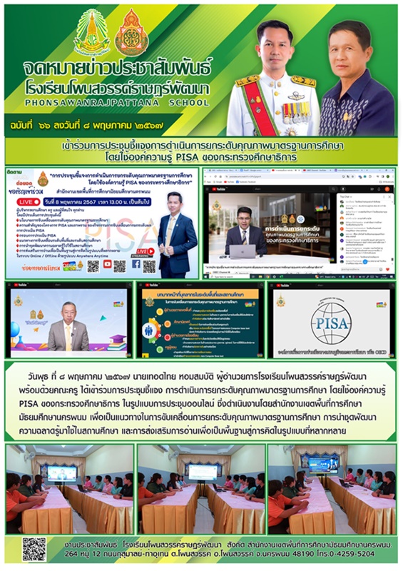วัน พุธ ที่ 8 พฤษภาคม 2567 เข้าร่วมการประชุมชี้แจงการดำเนินการยกระดับคุณภาพมาตรฐานการศึกษาโดยใช้องค์ความรู้ PISA ของกระทรวงศึกษาธิการ