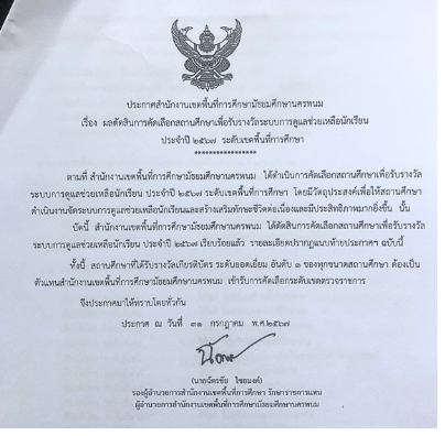 ตามที่ สำนักงานเขตพื้นที่การศึกษามัธยมศึกษาษานครพนม ได้ดำเนินการคัดเลือกสถานศึกษาเพื่อรับรางวัล ระบบการดูแลช่วย
