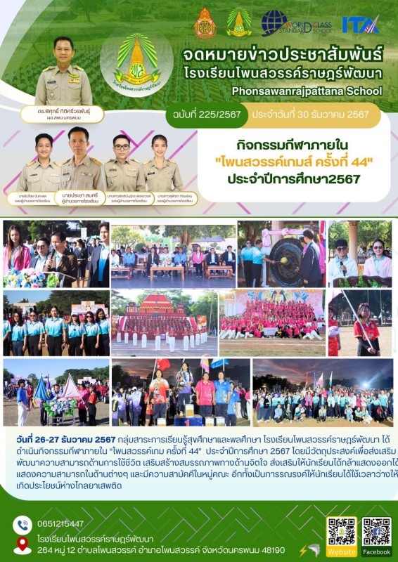นที่ 26-27 ธันวาคม 2567 กลุ่มสาระการเรียนรู้สุขศึกษาและพลศึกษา โรงเรียนโพนสวรรค์ราษฎร์พัฒนา ได้ดำเนินกิจกรรมกีฬาภายใน “โพนสวรรค์เกม ครั้งที่ 44” ประจำปีการศึกษา 2567 โดยมีวัตถุประสงค์เพื่อส่งเสริมพัฒนาความสามารถด้านการใช้ชีวิต เสริมสร้างสมรรถภาพทางด้านจิตใจ ส่งเสริมให้นักเรียนได้กล้าแสดงออกได้แสดงความสามารถในด้านต่างๆ และมีความสามัคคีในหมู่คณะ อีกทั้งเป็นการรณรงค์ให้นักเรียนได้ใช้เวลาว่างให้เกิดประโยชน์ห่างไกลยาเสพติด |