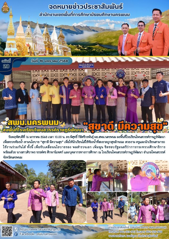 วันพฤหัสบดีที่ 16 มกราคม 2568 ดร.พิศุทธิ์ กิติศรีวรพันธ์ุ ผอ.สพม.นครพนม ลงพื้นที่โรงเรียนโพนสวรรค์ราษฏร์พัฒนา เพื่อตรวจห้องน้ำ ตามนโยบาย “สุขาดี มีความสุข” เพื่อให้นักเรียนได้ใช้ห้องน้ำที่สะอาดถูกสุขลักษณะ สวยงาม |