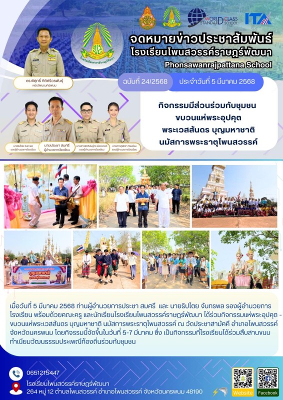 ท่านผู้อำนวยการประชา สมศรี และ นายธิปไตย จันทรพล รองผู้อำนวยการโรงเรียน พร้อมด้วยคณะครู และนักเรียนโรงเรียนโพนสวรรค์ราษฎร์พัฒนา ได้ร่วมกิจกรรมแห่พระอุปคุต - ขบวนแห่พระเวสสันดร บุญมหาชาติ นมัสการพระธาตุโพนสวรรค์ ณ วัดประชาสามัคคี อำเภอโพนสวรรค์ จังหวัดนครพนม โดยกิจรรมนี้จัดขึ้นในวันที่ 5-7 มีนาคม 2568 ซึ่งเป็นกิจกรรมที่โรงเรียนได้ร่วมสืบสานขนบทำเนียมวัฒนธรรมประเพณีท้องถิ่นร่วมกับชุมชน |