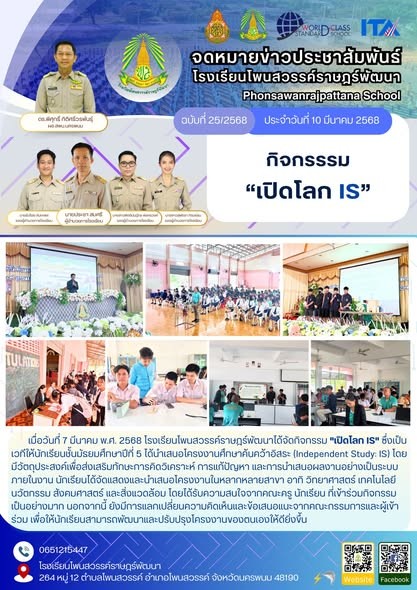 เมื่อวันที่ 7 มีนาคม พ.ศ. 2568 โรงเรียนโพนสวรรค์ราษฎร์พัฒนาได้จัดกิจกรรม "เปิดโลก IS" ซึ่งเป็นเวทีให้นักเรียนชั้นมัธยมศึกษาปีที่ 5 ได้นำเสนอโครงงานศึกษาค้นคว้าอิสระ (Independent Study: IS) โดยมีวัตถุประสงค์เพื่อส่งเสริมทักษะการคิดวิเคราะห์ การแก้ปัญหา และการนำเสนอผลงานอย่างเป็นระบบ ภายในงาน นักเรียนได้จัดแสดงและนำเสนอโครงงานในหลากหลายสาขา อาทิ วิทยาศาสตร์ เทคโนโลยี นวัตกรรม สังคมศาสตร์ และสิ่งแวดล้อม โดยได้รับความสนใจจากคณะครู นักเรียน ที่เข้าร่วมกิจกรรมเป็นอย่างมาก นอกจากนี้ ยังมีการแลกเปลี่ยนความคิดเห็นและข้อเสนอแนะจากคณะกรรมการและผู้เข้าร่วม เพื่อให้นักเรียนสามารถพัฒนาและปรับปรุงโครงงานของตนเองให้ดียิ่งขึ้น |
