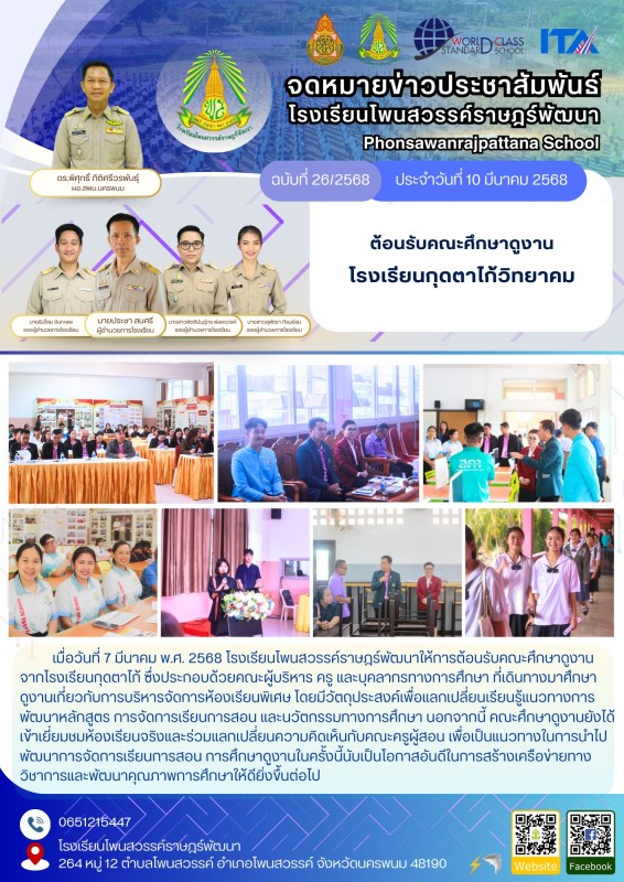 วันที่ 7 มีนาคม พ.ศ. 2568 โรงเรียนโพนสวรรค์ราษฎร์พัฒนาให้การต้อนรับคณะศึกษาดูงานจากโรงเรียนกุดตาไก้