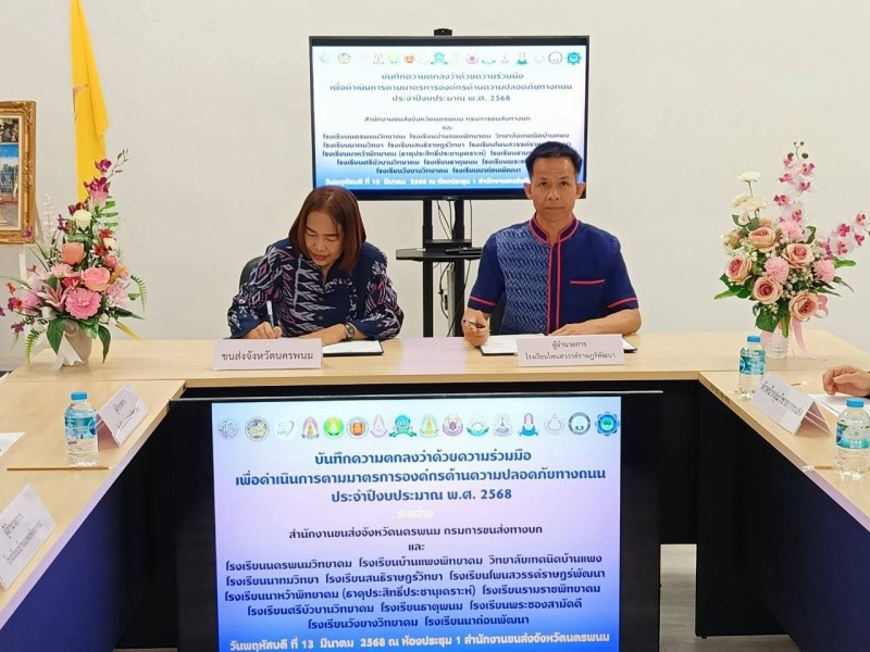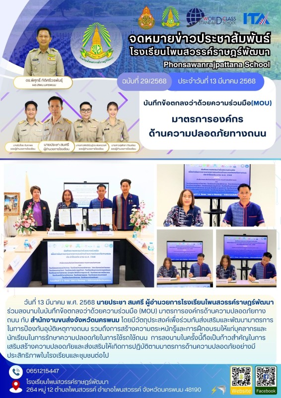 วันที่ 13 มีนาคม พ.ศ. 2568 นายประชา สมศรี ผู้อำนวยการโรงเรียนโพนสวรรค์ราษฎร์พัฒนา ร่วมลงนามในบันทึกข้อตกลงว่าด้วยความร่วมมือ (MOU) มาตรการองค์กรด้านความปลอดภัยทางถนน กับ สำนักงานขนส่งจังหวัดนครพนม โดยมีวัตถุประสงค์เพื่อร่วมกันส่งเสริมและพัฒนามาตรการในการป้องกันอุบัติเหตุทางถนน รวมถึงการสร้างความตระหนักรู้และการฝึกอบรมให้แก่บุคลากรและนักเรียนในการรักษาความปลอดภัยในการใช้รถใช้ถนน การลงนามในครั้งนี้ถือเป็นก้าวสำคัญในการเสริมสร้างความปลอดภัยและส่งเสริมให้เกิดการปฏิบัติตามมาตรการด้านความปลอดภัยอย่างมีประสิทธิภาพในโรงเรียนและชุมชนต่อไป |