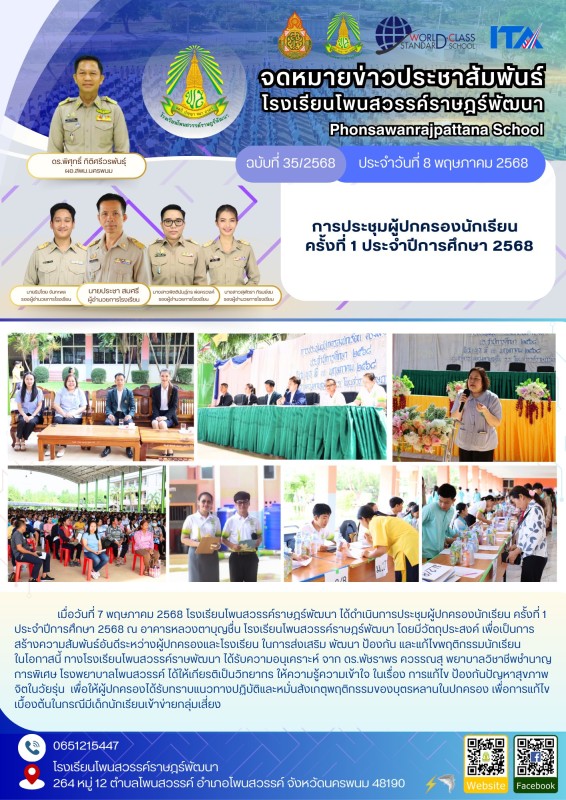 เมื่อวันที่ 7 พฤษภาคม 2568 โรงเรียนโพนสวรรค์ราษฎร์พัฒนา ได้ดำเนินการประชุมผู้ปกครองนักเรียน ครั้งที่ 1 ประจำปีการศึกษา 2568 ณ อาคารหลวงตาบุญชื่น โรงเรียนโพนสวรรค์ราษฎร์พัฒนา โดยมีวัตถุประสงค์ เพื่อเป็นการสร้างความสัมพันธ์อันดีระหว่างผู้ปกครองและโรงเรียน ในการส่งเสริม พัฒนา ป้องกัน และแก้ไขพฤติกรรมนักเรียน
