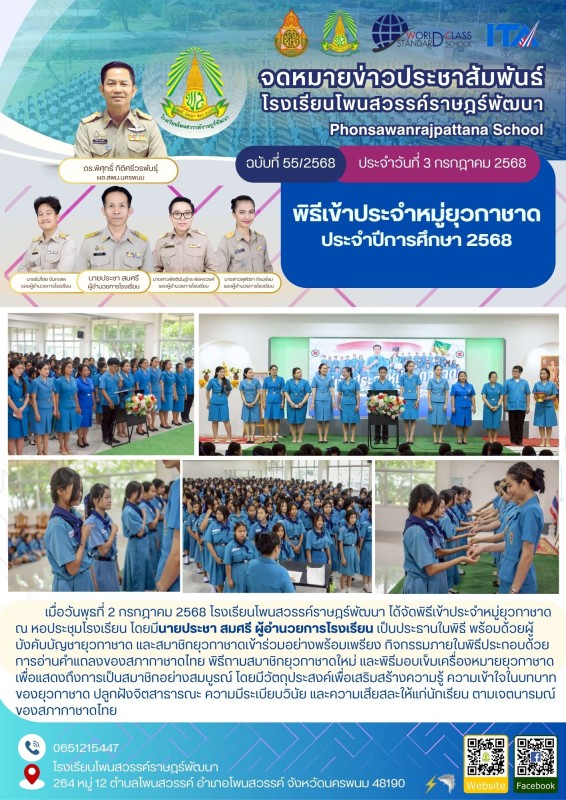 มื่อวันพุธที่ 2 กรกฎาคม 2568 โรงเรียนโพนสวรรค์ราษฎร์พัฒนา ได้จัดพิธีเข้าประจำหมู่ยุวกาชาด ณ หอประชุมโรงเรียน โดยมีนายประชา สมศรี ผู้อำนวยการโรงเรียน เป็นประธานในพิธี พร้อมด้วยผู้บังคับบัญชายุวกาชาด และสมาชิกยุวกาชาดเข้าร่วมอย่างพร้อมเพรียง กิจกรรมภายในพิธีประกอบด้วย การอ่านคำแถลงของสภากาชาดไทย พิธีถามสมาชิกยุวกาชาดใหม่ และพิธีมอบเข็มเครื่องหมายยุวกาชาด เพื่อแสดงถึงการเป็นสมาชิกอย่างสมบูรณ์ โดยมีวัตถุประสงค์เพื่อเสริมสร้างความรู้ ความเข้าใจในบทบาทของยุวกาชาด ปลูกฝังจิตสาธารณะ ความมีระเบียบวินัย และความเสียสละให้แก่นักเรียน ตามเจตนารมณ์ของสภากาชาดไทย |