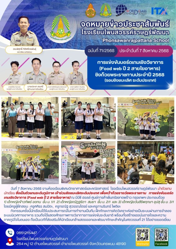 วันที่ 7 สิงหาคม 2568 งานห้องเรียนพิเศษวิทยาศาสตร์และคณิตศาสตร์ โรงเรียนโพนสวรรค์ราษฎร์พัฒนา นำตัวแทนนักเรียน ซึ่งเป็นตัวแทนระดับภูมิภาค เข้าร่วมชิงชนะเลิศระดับประเทศ เพื่อคว้าถ้วยรางวัลพระราชทาน การแข่งขันบอร์ดเกมเชิงวิชาการ (Food web ปี 2 สายใยอาหาร) ณ บีบีซี ฮอลล์ ศูนย์การค้าเซ็นทรัลลาดพร้าว กรุงเทพฯ