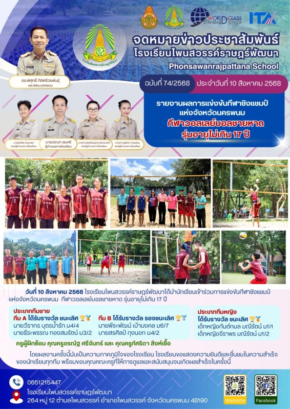 ขอแสดงความยินดีกับทีมวอลเล่บอลชายหาดรุ่นอายุไม่เกิน 17 ปี วันที่ 10 สิงหาคม 2568 โรงเรียนโพนสวรรค์ราษฎร์พัฒนาได้นำนักเรียนเข้าร่วมการแข่งขันกีฬาชิงแชมป์แห่งจังหวัดนครพนม กีฬาวอลเลย์บอลชายหาด รุ่นอายุไม่เกิน 17 ปี