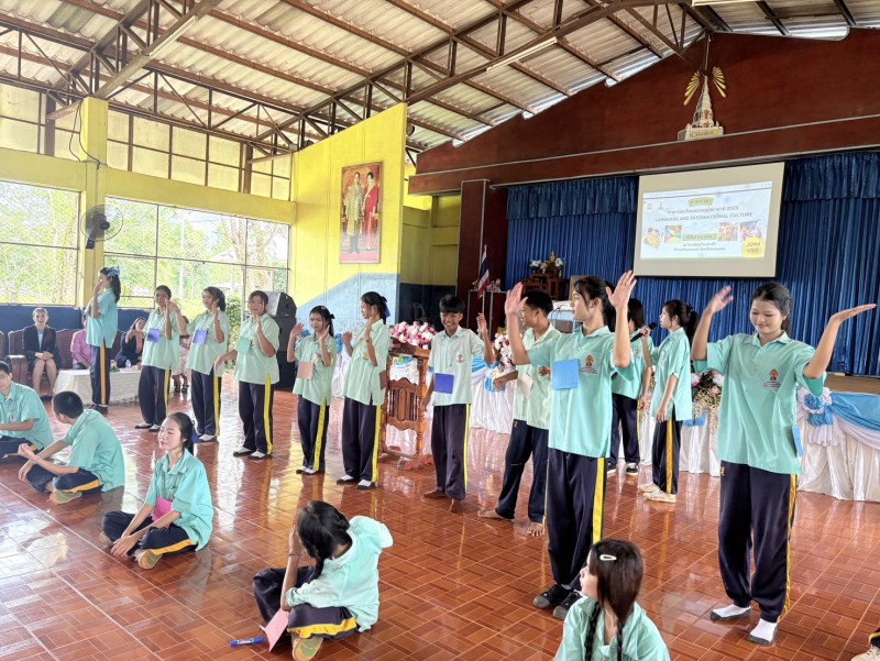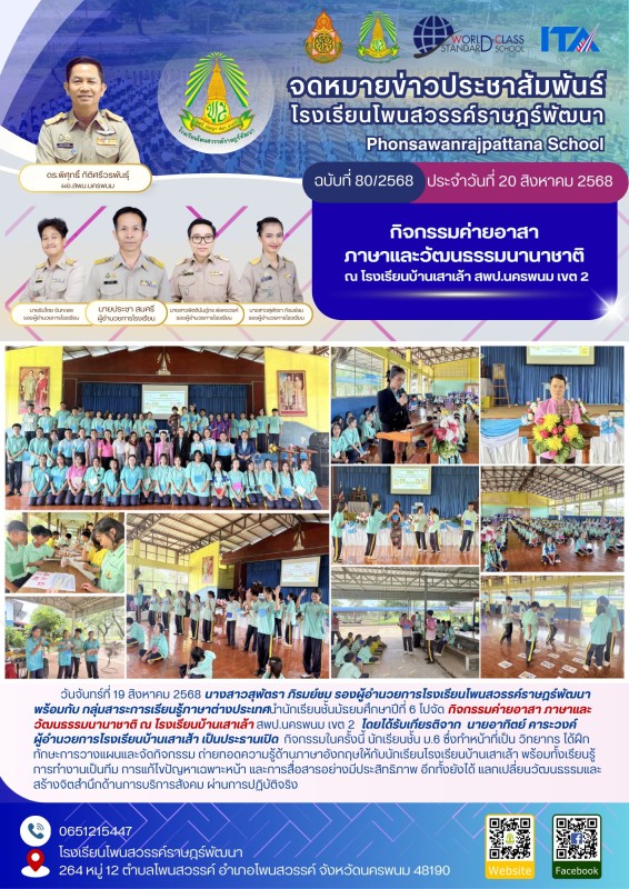 วันจันทร์ที่ 19 สิงหาคม 2568 นางสาวสุพัตรา ภิรมย์ชม รองผู้อำนวยการโรงเรียนโพนสวรรค์ราษฎร์พัฒนาพร้อมกับ กลุ่มสาระการเรียนรู้ภาษาต่างประเทศนำนักเรียนชั้นมัธยมศึกษาปีที่ 6 ไปจัดกิจกรรมค่ายอาสา ภาษาและวัฒนธรรมนานาชาติ ณ โรงเรียนบ้านเสาเล้า สพป.นครพนม เขต 2