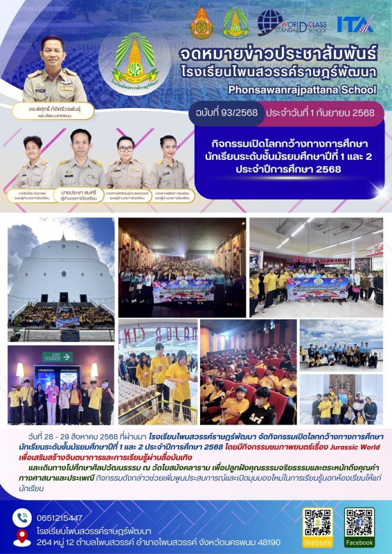 วันที่ 28 - 29 สิงหาคม 2568 ที่ผ่านมา โรงเรียนโพนสวรรค์ราษฎร์พัฒนา จัดกิจกรรมเปิดโลกกว้างทางการศึกษา นักเรียนระดับชั้นมัธยมศึกษาปีที่ 1 และ 2 ประจำปีการศึกษา 2568 โดยมีกิจกรรมชมภาพยนตร์เรื่อง Jurassic World เพื่อเสริมสร้างจินตนาการและการเรียนรู้ผ่านสื่อบันเทิง