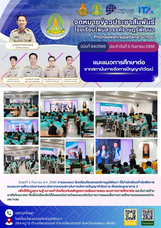 วันพุธที่ 3 กันยายน พ.ศ. 2568 ที่ผ่านมา งานแนะแนว โรงเรียนโพนสวรรค์ราษฎร์พัฒนา ได้นำนักเรียนเข้ารับฟังการแนะแนวการศึกษาต่อจากคณะวิทยากรของสถาบันการจัดการปัญญาภิวัฒน์ ณ ห้องประชุมอาคาร 3