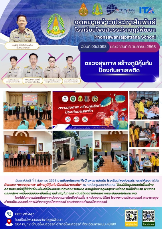วันพฤหัสบดี ที่ 4 กันยายน 2568 งานป้องกันและแก้ไขปัญหายาเสพติด โรงเรียนโพนสวรรค์ราษฎร์พัฒนา ได้จัดกิจกรรม “ตรวจสุขภาพ สร้างภูมิคุ้มกัน ป้องกันยาเสพติด”