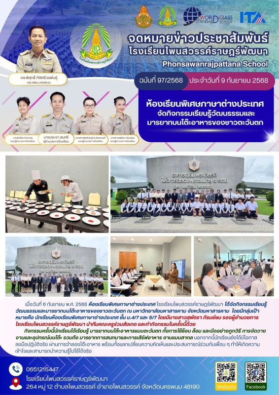 เมื่อวันที่ 6 กันยายน พ.ศ. 2568 ห้องเรียนพิเศษภาษาต่างประเทศ โรงเรียนโพนสวรรค์ราษฎร์พัฒนา ได้จัดกิจกรรมเรียนรู้วัฒนธรรมและมารยาทบนโต๊ะอาหารของชาวตะวันตก ณ มหาวิทยาลัยมหาสารคาม จังหวัดมหาสารคาม
