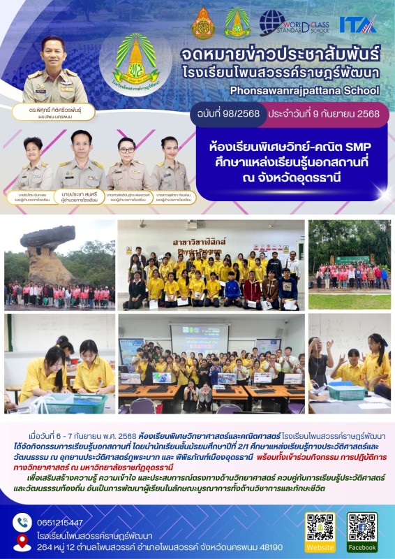 เมื่อวันที่ 6 – 7 กันยายน พ.ศ. 2568 ห้องเรียนพิเศษวิทยาศาสตร์และคณิตศาสตร์ โรงเรียนโพนสวรรค์ราษฎร์พัฒนา ได้จัดกิจกรรมการเรียนรู้นอกสถานที่ โดยนำนักเรียนชั้นมัธยมศึกษาปีที่ 2/1 ศึกษาแหล่งเรียนรู้ทางประวัติศาสตร์และวัฒนธรรม ณ อุทยานประวัติศาสตร์ภูพระบาท และ พิพิธภัณฑ์เมืองอุดรธานี พร้อมทั้งเข้าร่วมกิจกรรม การปฏิบัติการทางวิทยาศาสตร์ ณ มหาวิทยาลัยราชภัฏอุดรธานี