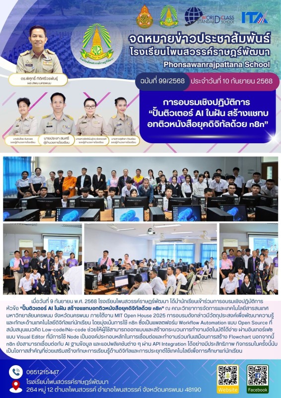 เมื่อวันที่ 9 กันยายน พ.ศ. 2568 โรงเรียนโพนสวรรค์ราษฎร์พัฒนา ได้นำนักเรียนเข้าร่วมการอบรมเชิงปฏิบัติการ หัวข้อ “ปั้นติวเตอร์ AI ในฝัน สร้างแชทบอทติวหนังสือยุคดิจิทัลด้วย n8n” ณ คณะวิทยาการจัดการและเทคโนโลยีสารสนเทศ มหาวิทยาลัยนครพนม จังหวัดนครพนม ภายใต้งาน MIT Open House 2025