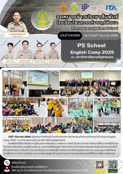 1 ธันวาคม 2568 กลุ่มสาระการเรียนรู้ภาษาต่างประเทศ จัดกิจกรรมค่ายภาษาอังกฤษ PS School English Camp 2025 ณ หอประชุมจามจุรี มหาวิทยาลัยราชภัฎสกลนคร
