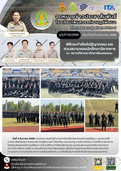 นายประชา สมศรี ผู้อำนวยการโรงเรียนโพนสวรรค์ราษฎร์พัฒนา มอบหมายให้นางสาวพิตตินันฎ์กร พ่อครวงค์ รองผู้อำนวยการโรงเรียน และคณะครู งานรักษาดินแดน นำนักศึกษาวิชาทหารโรงเรียนโพนสวรรค์ราษฎร์พัฒนา เข้าร่วมพิธีกระทำสัตย์ปฏิญาณตน และสวนสนามของนักศึกษาวิชาทหาร ประจำปีการศึกษา 2568 ณ สนามกีฬามหาวิทยาลัยนครพนม เพื่อเป็นการแสดงออกถึงความมีระเบียบวินัย ความอดทน ความเข้มแข็ง และความพร้อมเพรียงกัน รวมทั้งเพื่อเป็นการรำลึกถึงวีรกรรมของยุวชนทหาร