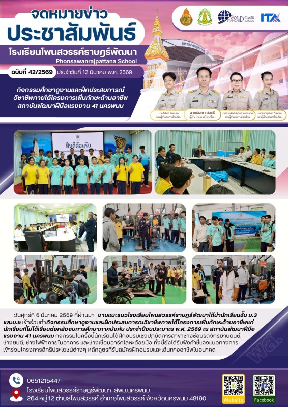 วันศุกร์ที่ 6 มีนาคม 2569 ที่ผ่านมา งานแนะแนวโรงเรียนโพนสวรรค์ราษฎร์พัฒนาได้นำนักเรียนชั้น ม.3 และม.5 เข้าร่วมทำกิจกรรมศึกษาดูงานและฝึกประสบการณวิชาชีพภายใต้โครงการเพิ่มทักษะด้านอาชีพแก่นักเรียนที่ไม่ได้เรียนต่อหลังจบการศึกษาภาคบังคับ ประจำปีงบประมาณ พ.ศ. 2569 ณ สถาบันพัฒนาฝีมือแรงงาน 41 นครพนม กิจกรรมในครั้งนี้นักเรียนได้ฝึกอบรมเชิงปฏิบัติการสาขาช่างซ่อมรถจักรยานยนต์,
