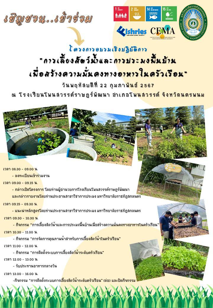 22 กุมภาพันธ์ 2567 เชิญชวนร่วมอบรมเชิงปฏิบัติการ การเลี้ยงสัตว์น้ำและการประมงพื้นบ้านเพื่อสร้างความมั่นคงทางอาหารในครัวเรือน