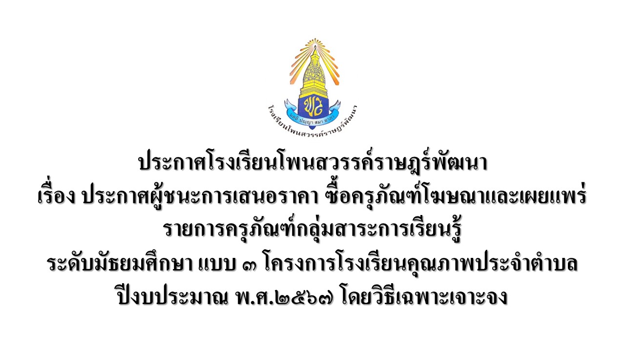 ประกาศโรงเรียนโพนสวรรค์ราษฎร์พัฒนา เรื่อง ประกาศผู้ชนะการเสนอราคา ซื้อครุภัณฑ์โฆษณาและเผยแพร่ รายการครุภัณฑ์กลุ่มสาระการเรียนรู้ ระดับมัธยมศึกษา แบบ ๓ โครงการโรงเรียนคุณภาพประจำตำบล ปีงบประมาณ พ.ศ.๒๕๖๗ โดยวิธีเฉพาะเจาะจง