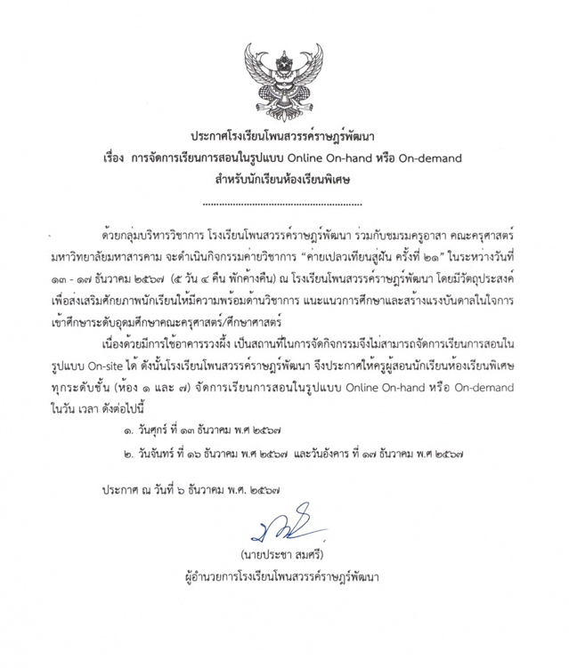 ประกาศ การจัดการเรียนการสอนในรูปแบบ Online On-hand หรือ On- demand สำหรับนักเรียนห้องเรียนพิเศษ