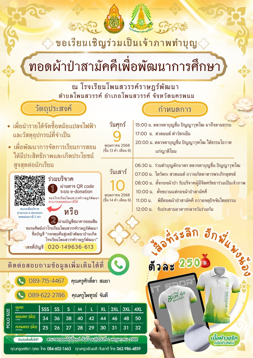 ขอเชิญร่วมเป็นเจ้าภาพทำบุญทอดผ้าป่าสามัคคีเพื่อพัฒนาการศึกษา